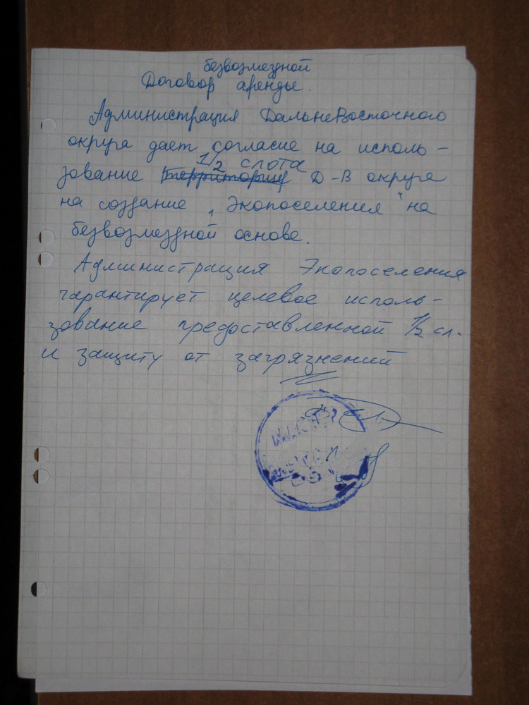 Администрация ДВФО дает согласие не использование 1/2 слота ДВФО на создание экопоселения на безвозмездной основе. Администрация Экопоселения гаранстирует целевое использование предоставленной территории и защиту от загрязнений.