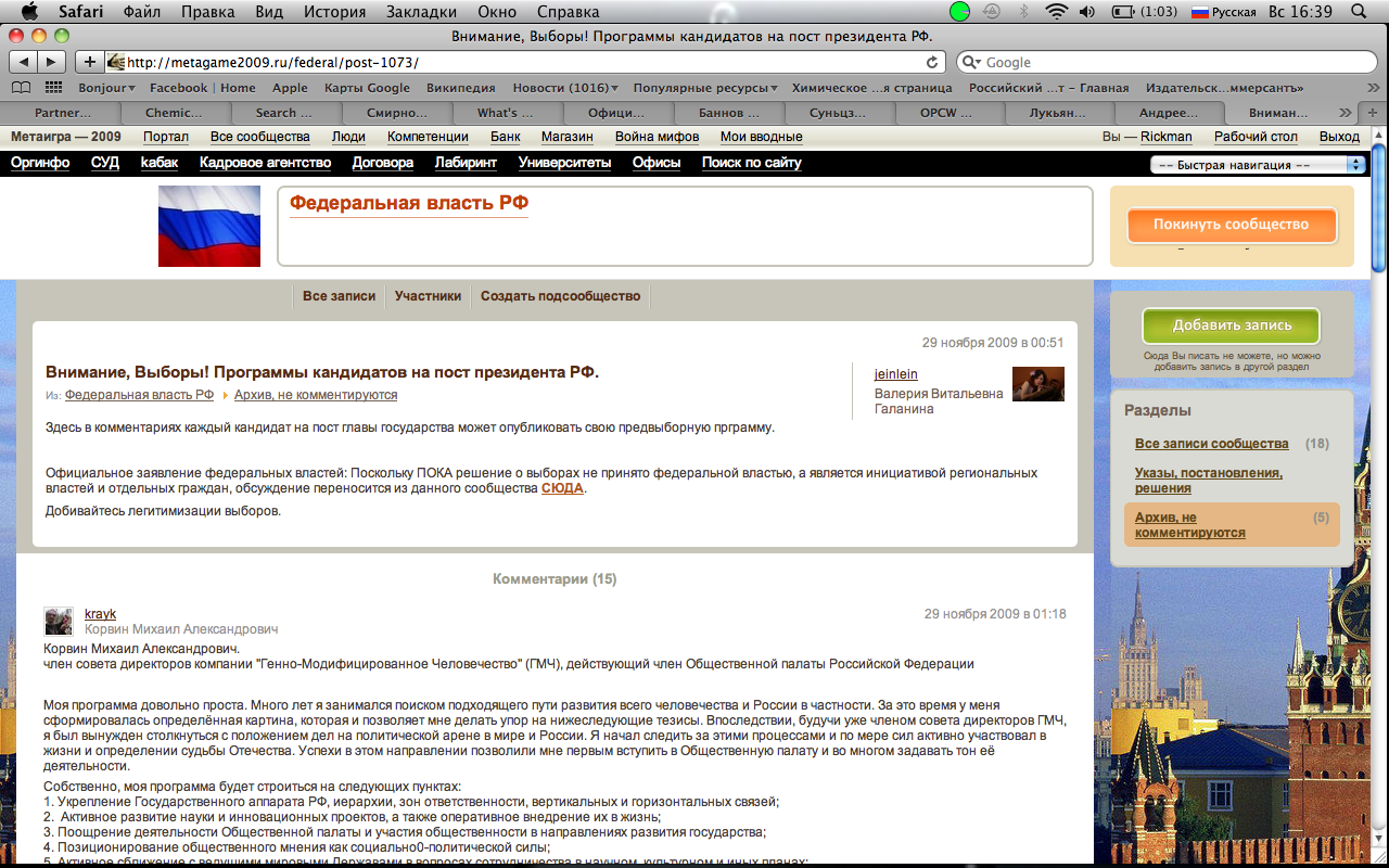 Приложение №3 к иску Против Всех Кандидатов. Как видно из приведенного во вложении принт скрина - Федеральная Власть вообще еще не принимала решения о проведении голосования на пост президента РФ на 29.11.09. Соответственно ЦИК не мог принимать решения о регистрации кандидатов 28.11.09. Соответственно, если такое решение будет принято, то это состоится либо 29 или 30 числа и соответственно регистрация технически будет до 00:00 29 или 30 декабря.  На основании того, что я подал заявление до 00:00 29 декабря 2009 г. прошу внести кандидата Против Всех Кандидатов на в список кандидатов на пост президента РФ.